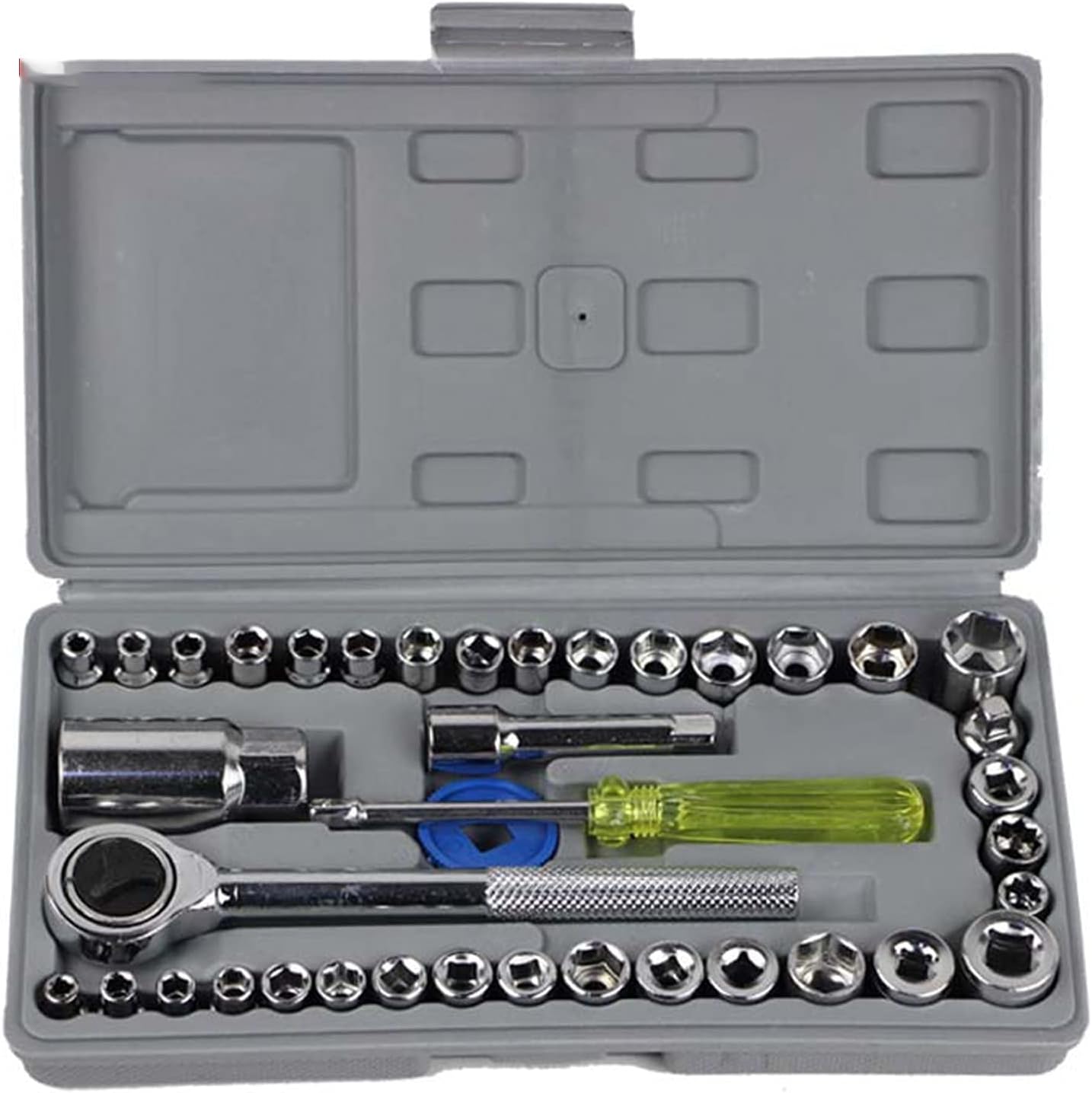 Ovaj set ključeva sa čegrtaljkom od 40 komada izrađen je od visokokvalitetnog nerđajućeg čelika sa hrom-vanadijumskim premazom, što garantuje izuzetnu otpornost na koroziju i habanje. Komplet sadrži sve što vam je potrebno za različite projekte: 14 milimetarskih gedora, 14 colovnih gedora, 3 osmougaone gedore, odvijač, adapter, gedoru za svećice, produžetak i plastični disk.